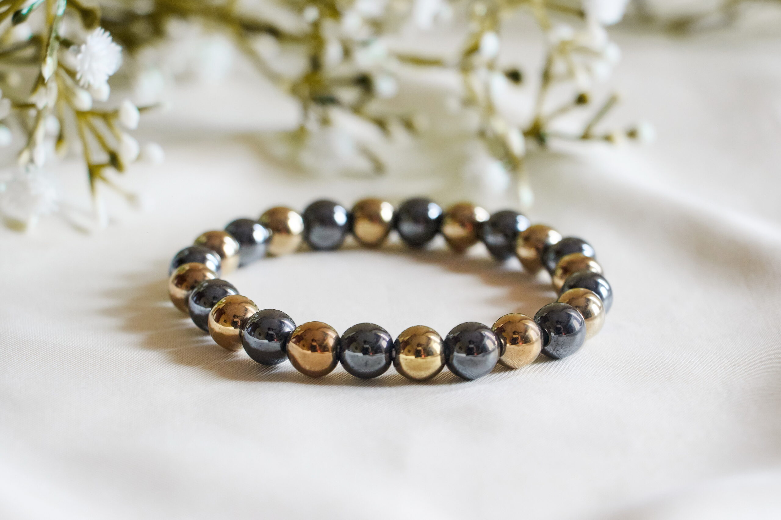The Black & Gold Hematite Bracelet is crafted from natural hematite beads with elegant gold accents. Hematite is renowned for its grounding and protective properties, helping absorb negative energy and promoting mental clarity.