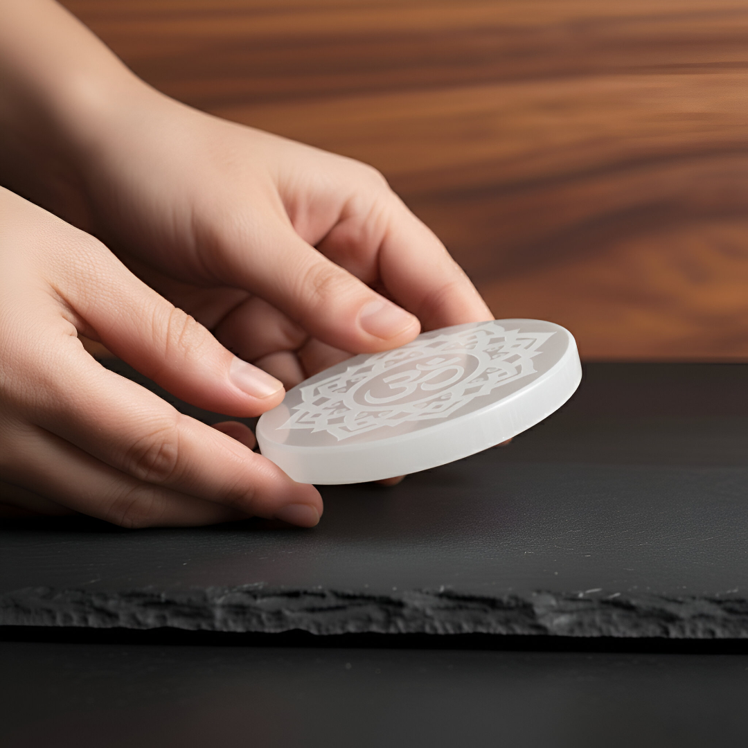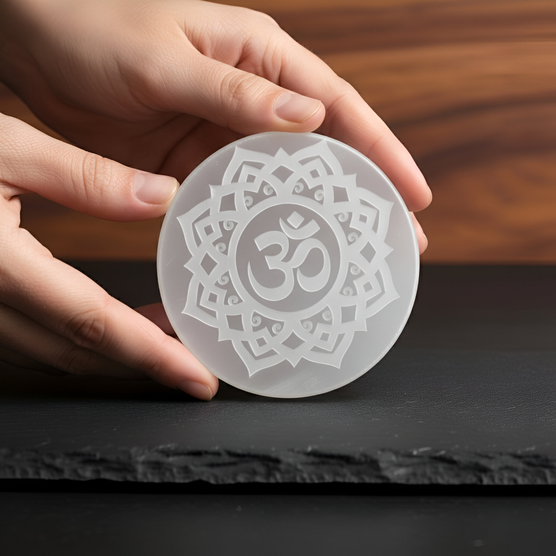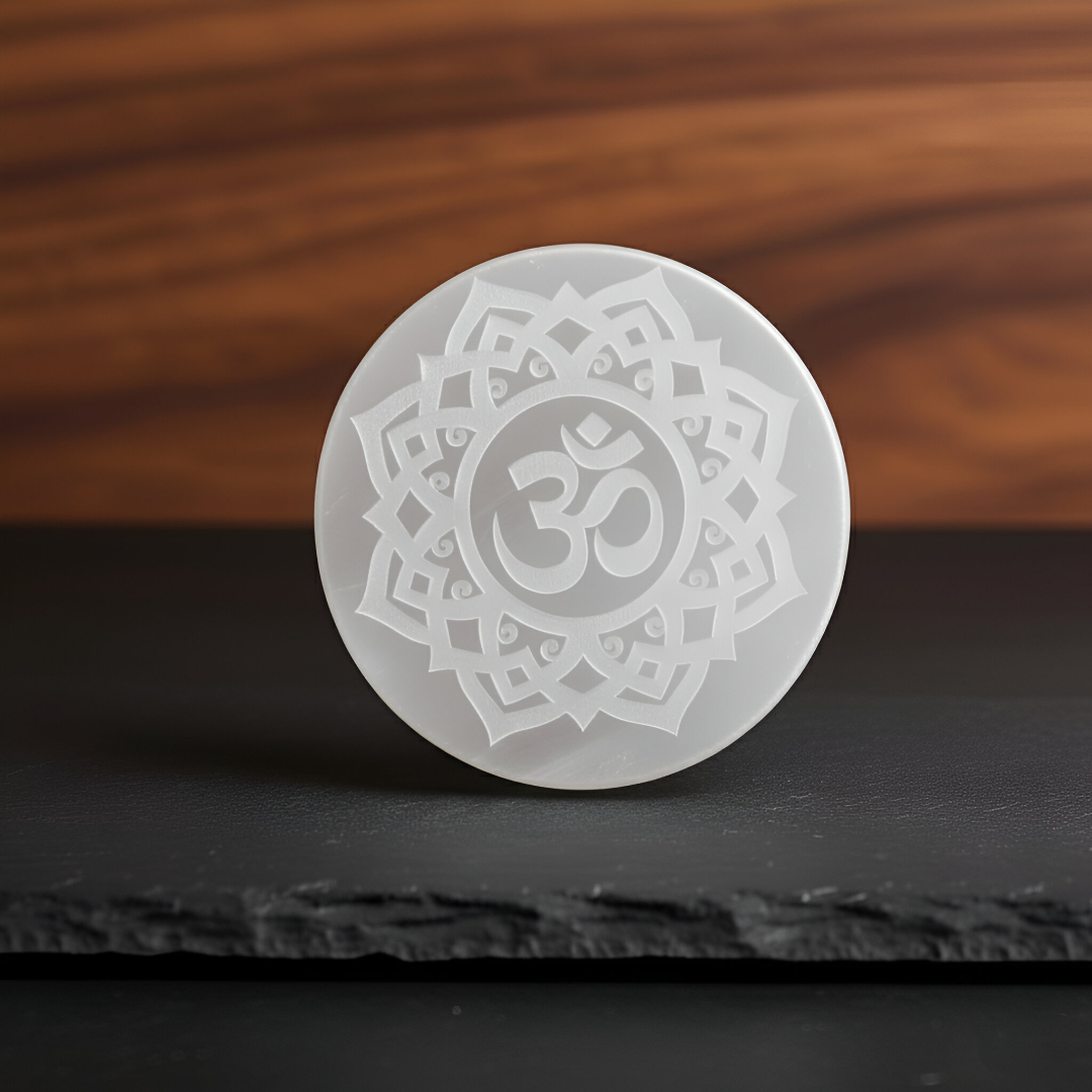 The Selenite Plate Symbol of OM is a sacred energy tool used for crystal cleansing and recharging. Known for its pure and high vibration, Selenite clears negative energy, amplifies positivity, and restores harmony in your surroundings.